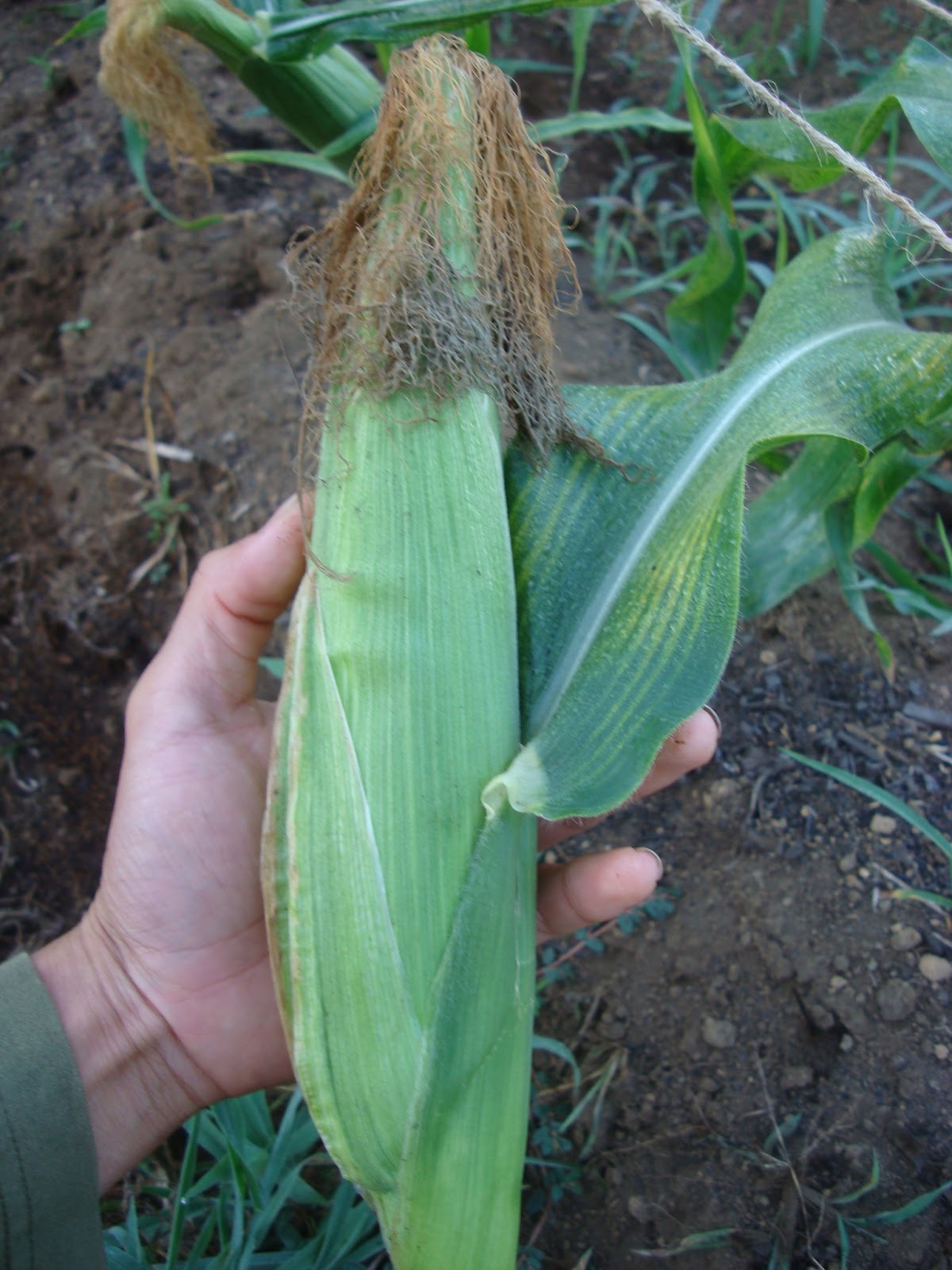 さてさて、トウモロコシの毛先が枯れてちじれてきたので「収穫合図」と見なして収穫しました。実もパンパンになっているのか触ると張りがあります。親父に言われた収穫のコツはこのタイミングを見ることと(実は僕は1つフライングで収穫して全く甘くありませんでした…)、朝日が昇る前に収穫すること、この2点です。日が昇ると根から吸収し実に蓄えられた養分は、光合成をするため葉に回されます。その行程に入る前に収穫すると甘いコーンにありつける、という訳です。野菜は当然ながら、「生もの」ですので収穫直後に茹でるなど加工するのが一番味を良く頂ける方法です。これが出来るというのも最高の贅沢ですね!!味の方は風よけ作ったりした甲斐もあってか、想像以上に甘く、養分がギリギリだったのか実の入りは歯並びの悪い子のようになっていましたが、味はホントに感動的でした。コメやコーンは太古から栽培してきただけあって、何か感動する深さが違う感じがするのは気のせいでしょうか??笑